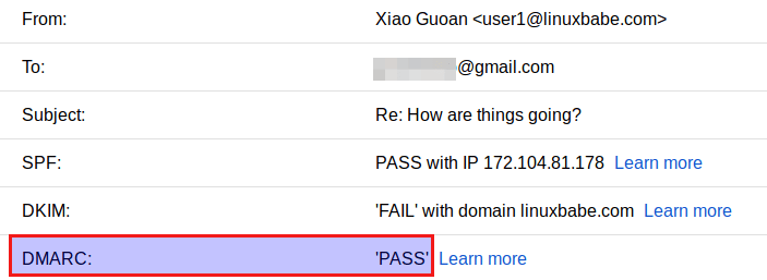 You can see that I used two email addresses to receive DMARC report, which I will explain later. There’s another command line tool (opendmarc-check) that you can use to check DMARC record. It’s provided by the opendmarc package.