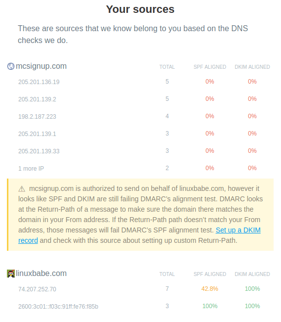 Below is my first weekly report sent from Postmark. mcsignup.com belongs to MailChimp, which is what I use to send newsletters to my mailing list. In my SPF record, I actually allows MailChimp to send emails on behalf of me, but I didn’t know that they don’t use my domain name in the Return-Path header for the signup confirmation emails. And they don’t sign emails using my DKIM domain. What surprises me more is that 42.8% of emails sent from my own email server (74.207.252.70) failed SPF alignment.
